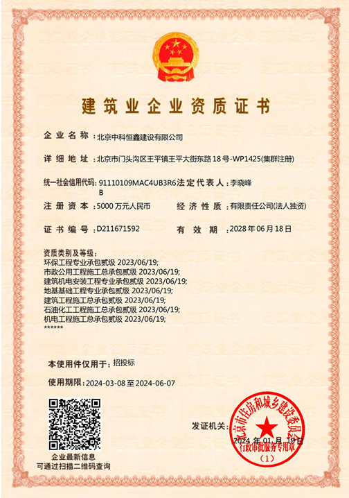 北京中科恒鑫建設有限公司資質范圍及等級: